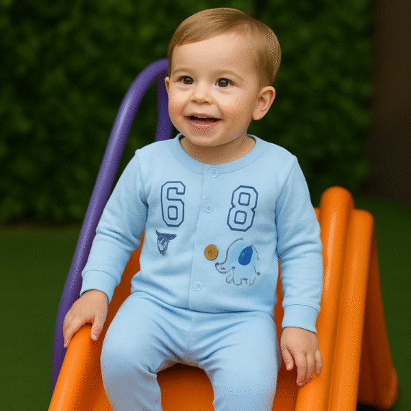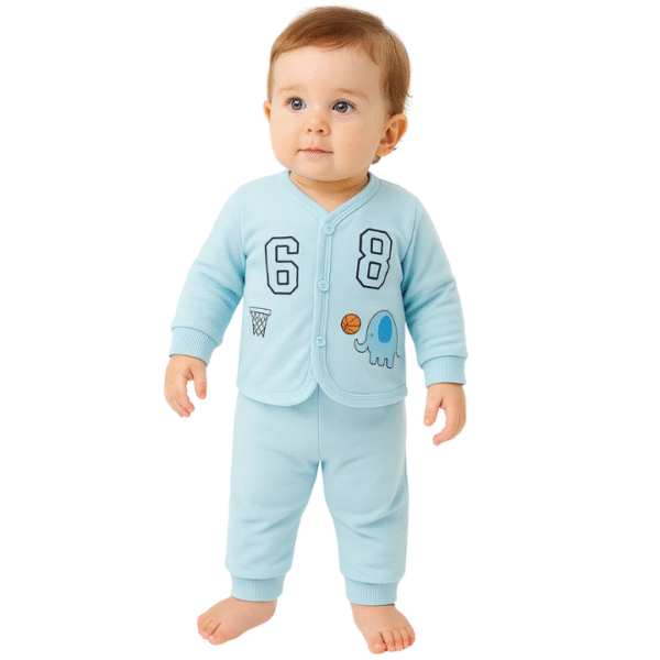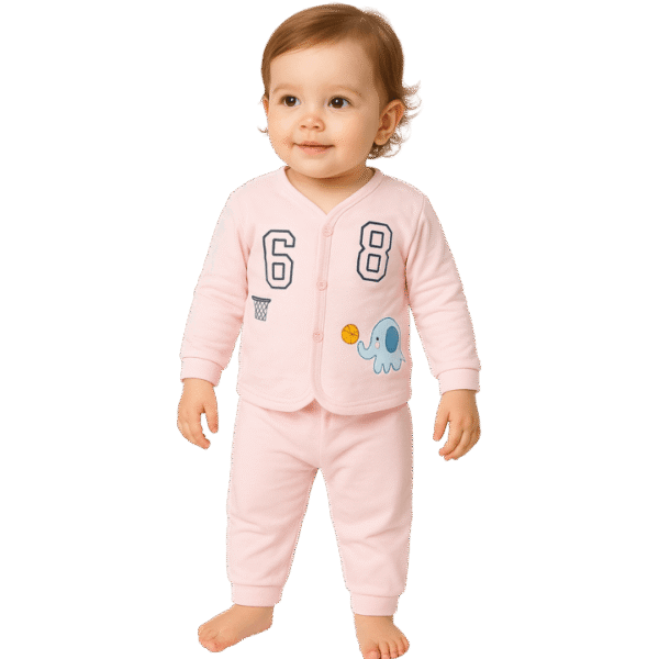 Keep your little one cozy, stylish, and happy with this adorable 2-piece baby cotton suit. Designed with love, the outfit includes a soft button-up top featuring bold “68” numbers and a playful elephant basketball print, paired with matching elastic-waist pants for all-day comfort.