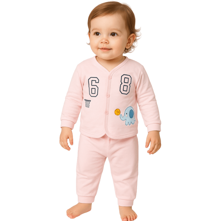 Cute and comfy 2-piece cotton baby suits with elephant & basketball print. Available in 3 colors (Light Blue, Pink, Grey-Blue). Perfect for daily wear, playtime, and gifting.